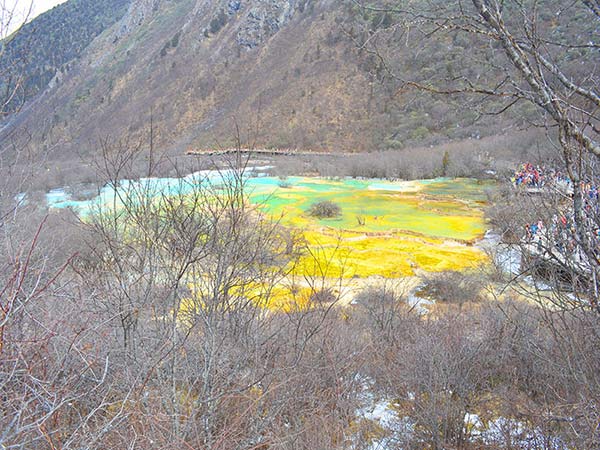 10:00—14:00 错峰游览黄龙风景区(门票淡季 60 元,旺季 170 元。游览需自理。黄龙索道上行 80 元,下行 40元。观光车 20 元。一般游览方式为坐上行索道,乘坐观光车再步行下山游览,自费自愿乘坐。)